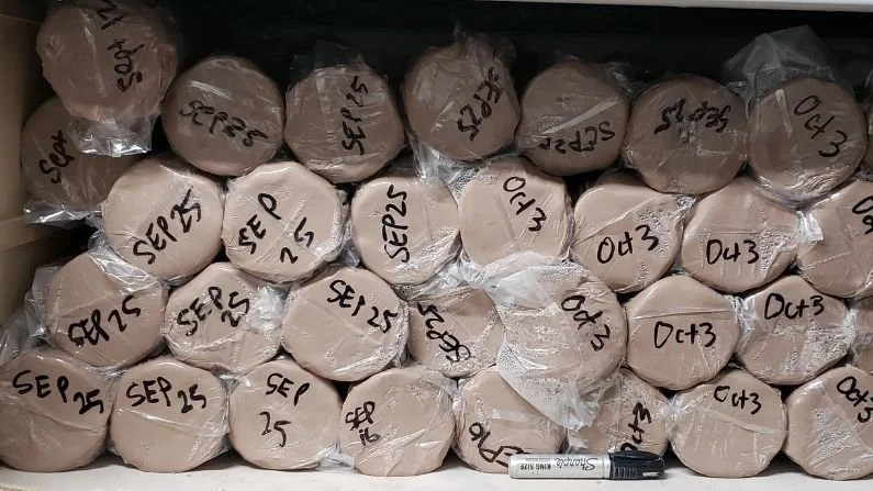2. I pug it; Your clay is pugged, vacuumed, and rolled into smooth 3" logs — moist, sealed, and ready to use.